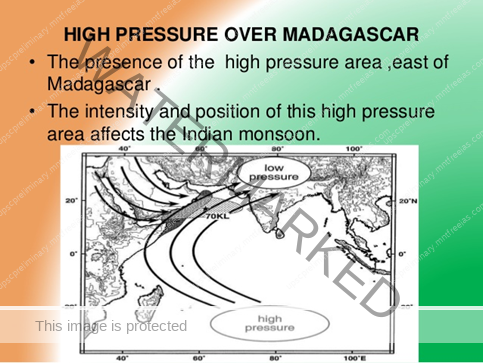 (c) The presence of the high-pressure area, east of Madagascar, approximately at 20°S over the Indian Ocean. The intensity and position of this high-pressure area affects the Indian Monsoon.