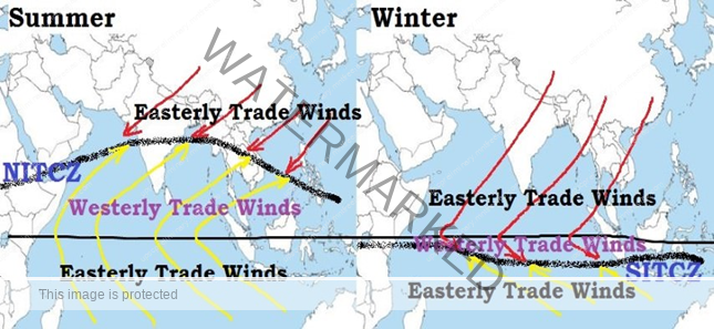 (b) The shift of the position of Inter Tropical Convergence Zone (ITCZ) in summer, over the Ganga plain (this is the equatorial trough normally positioned about 5°N of the equator – also known as the monsoon trough during the monsoon season).
