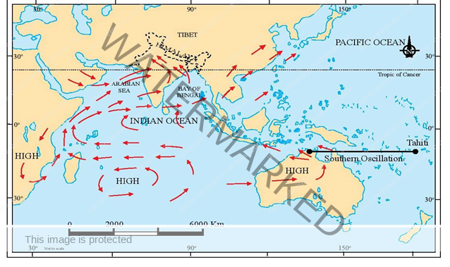 (a) The differential heating and cooling of land and water creates low pressure on the landmass of India while the seas around experience comparatively high pressure.