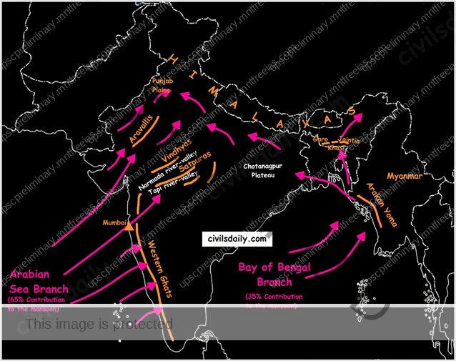 - THE BAY OF BENGAL BRANCH –The Arakan Hills along the coast of Myanmar deflect a big portion of this branch towards the Indian subcontinent. The monsoon, therefore, enters West Bengal and Bangladesh from south and southeast instead of from the south-westerly direction.